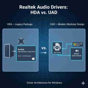 HDA and UAD are not simply different names; they are completely different ways that Windows handles drivers. Drivers for UAD in the Present are smaller and will work with all versions of Windows. They simply have the basic driver files. The Realtek Audio Console from the Microsoft Store takes care of the control choices, such as sound effects and equalizer settings.